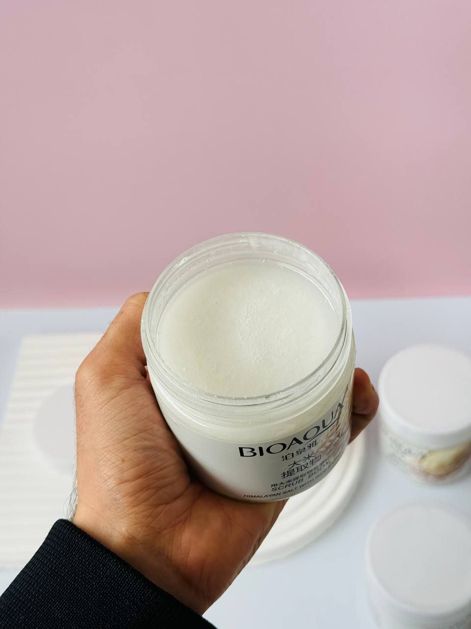 مقدار مناسبی از اسکراب نمک و برنج بیوآکوا را روی پوست مرطوب خود بمالید.