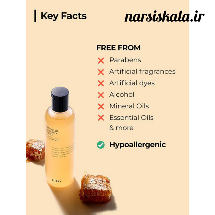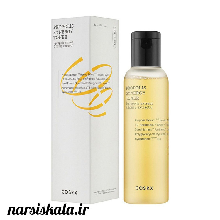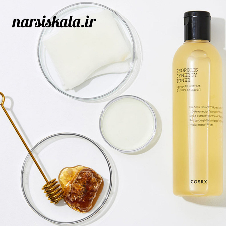 تونر آبرسان و ترمیم کننده پروپولیس کوزارکس COSRX Full Fit Propolis Synergy Toner حاوی عصاره پروپولیس است که معروف به خواص ضد التهابی، ضد باکتریایی و ترمیم کنندهاش است. این ترکیبات به ترمیم بافت پوست کمک میکنند و علائم آسیبهای پوستی را کاهش میدهند.
