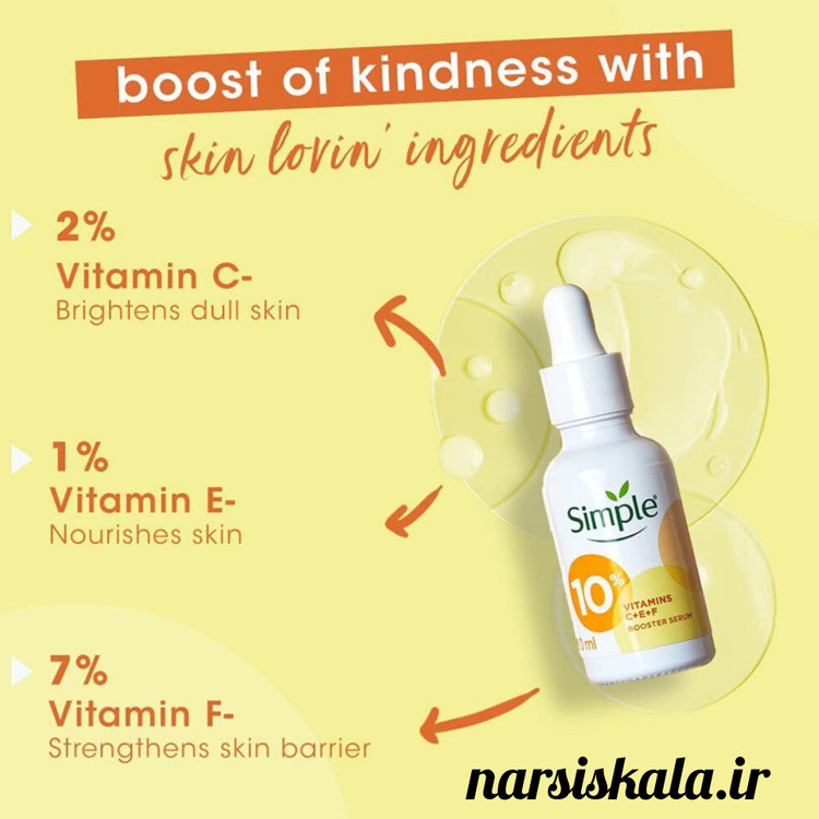 سرم ویتامینه سیمپل حاوی ویتامین C+E+F سلامت پوست را تضمین کرده و پوست را بهبود می بخشد