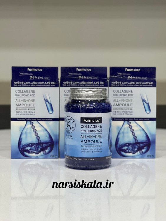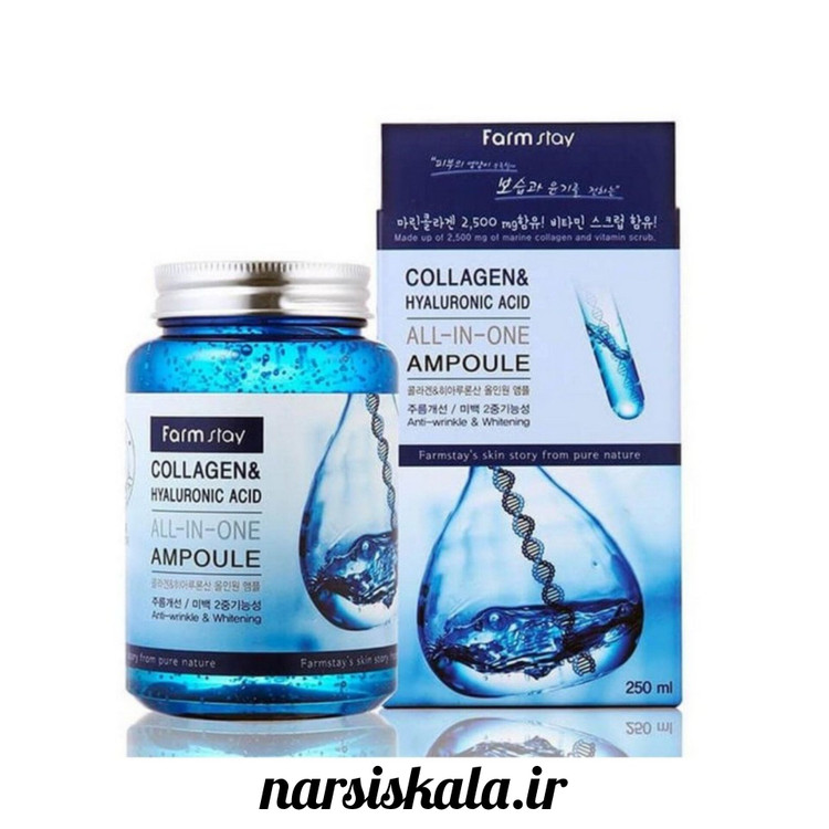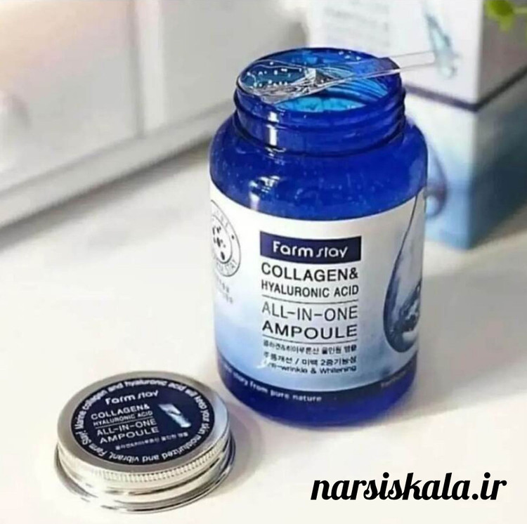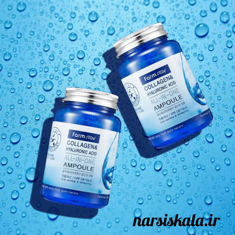 این آمپول ترکیبی از دو ماده موثر کلاژن و هیالورونیک اسید بوده و همچنین غنی از ویتامین ها و مواد معدنی و عصاره جوجوبا می باشد. آمپول کلاژن و هیالورونیک اسید آل این وان FarmStay پوست را به خوبی آبرسانی و مرطوب می کند. این محصول به بهبود خطوط و چروک ریز پوستی کمک کرده و از ایجاد علائم پیری پوست جلوگیری می نماید.